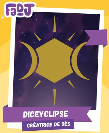 En quête de dés artisanaux, uniques, originaux et faits en France ? Bienvenue chez Diceyclipse ! Ici, vous trouverez des dés artisanaux pour JDR et jeux de société, faits de A à Z par Louise (l'humaine derrière Diceyclipse) en Côtes d'Armor.